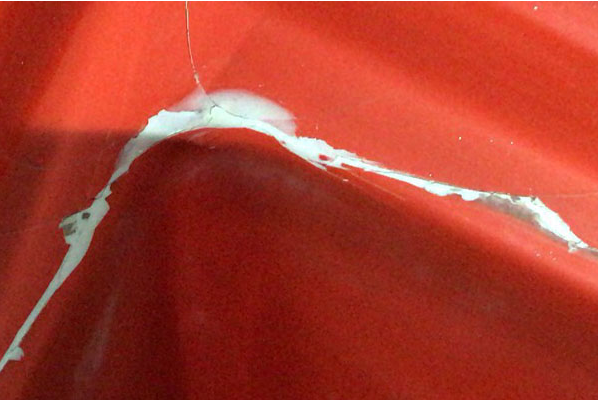 模具制作工藝不嚴(yán)謹(jǐn),也會導(dǎo)致膠衣層開裂脫層。根據(jù)經(jīng)驗(yàn)來看,上圖所示的破損的膠衣層下出現(xiàn)泛白的積層,也就是我們常說的零收縮樹脂,這種高填料的模具樹脂,通常會降低與乙烯基膠衣的粘結(jié)力。出現(xiàn)這種情況最好是能在兩者之間做個過渡層-乙烯基聚酯樹脂。