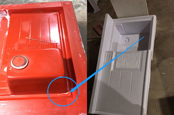 小編通過客戶有了解到,衛(wèi)浴制品基本都是用玻璃鋼模具來制作完成的,但工人們非??鄲?,因?yàn)槊看蚊撃6紩嬖谝欢ǖ睦щy,很多時候只能通過暴力的方式進(jìn)行脫模。如上圖所示,由于膠衣層受力過大造成了膠衣開裂和局部脫層,這時候膠衣層斷裂的原因就明顯地出來了。