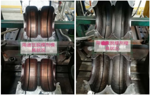 以上就是輪胎膠囊隔離劑的使用方法,在同一硫化機(jī)的左右模對比觀察,使用迪瓦輪胎膠囊隔離劑和使用其他品牌隔離劑的模具表面有明顯的區(qū)別。結(jié)果表明,使用迪瓦輪胎膠囊隔離劑能延長硫化模具清洗周期1倍或以上。