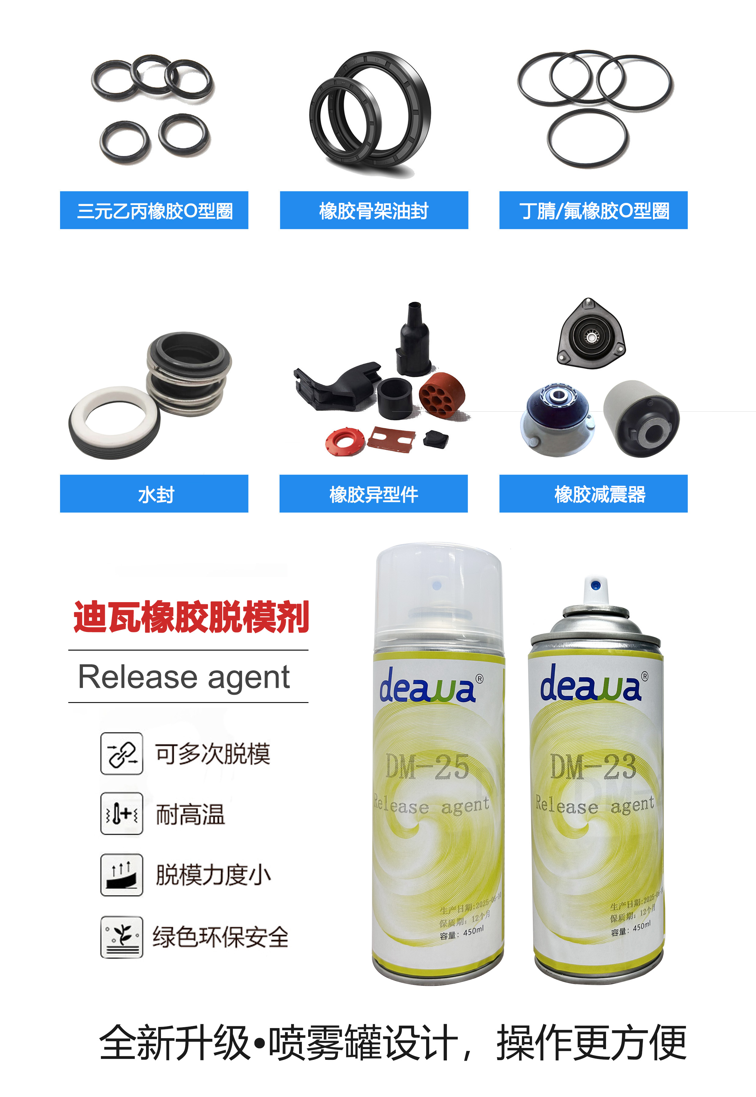 優(yōu)質(zhì)脫模劑不僅保障產(chǎn)品完整脫模,更能有效減少模具積垢,降低洗模頻次,從而提升整體產(chǎn)線效率。迪瓦(Deawa)專注脫模領(lǐng)域25年,依托自主研發(fā)實力,推出多款高性能橡膠脫模劑。其代表性產(chǎn)品DW23DW25專為各類橡膠制品設(shè)計,具備以下優(yōu)勢: